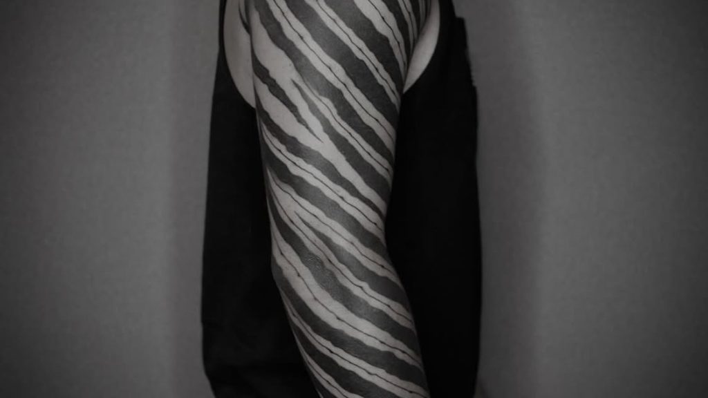 シンプルなのに、目を奪う。 シマウマ模様のトライバルスリーブタトゥー。 一見ランダムに見えるラインは