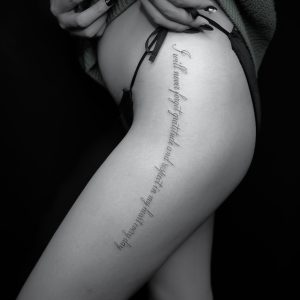 レタリングタトゥーを腿側面に彫り、曲げても綺麗な流れが出るように配置していきました。 ここに来てくれ
