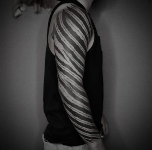 シンプルなのに、目を奪う。 シマウマ模様のトライバルスリーブタトゥー。 一見ランダムに見えるラインは